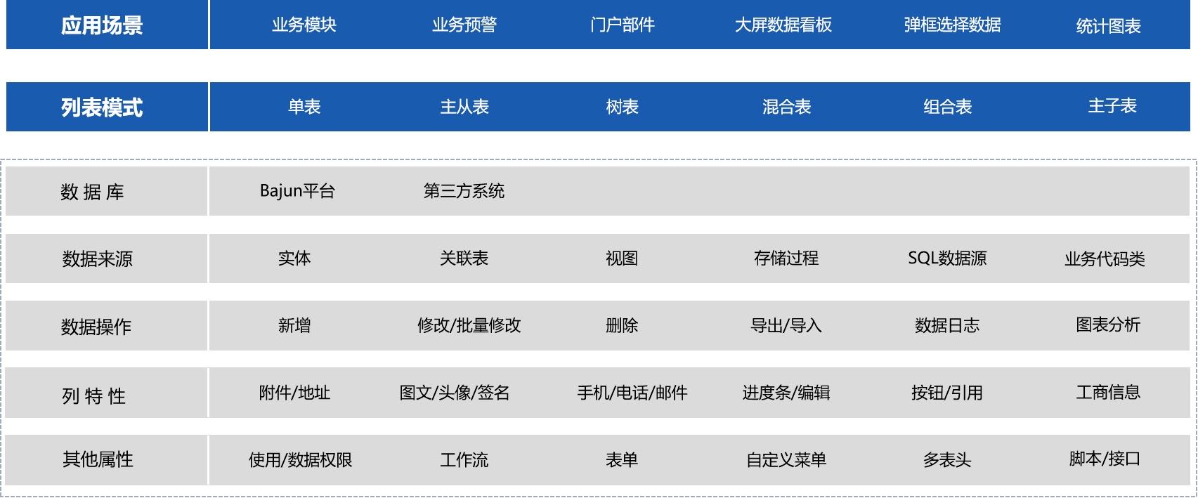 八駿平臺建模引擎支持自定義表單、單列表、主從列表、樹表、混合表、主子表、組合表等多種前端頁面展現方式,實現自由升級老功能或添加新功能。