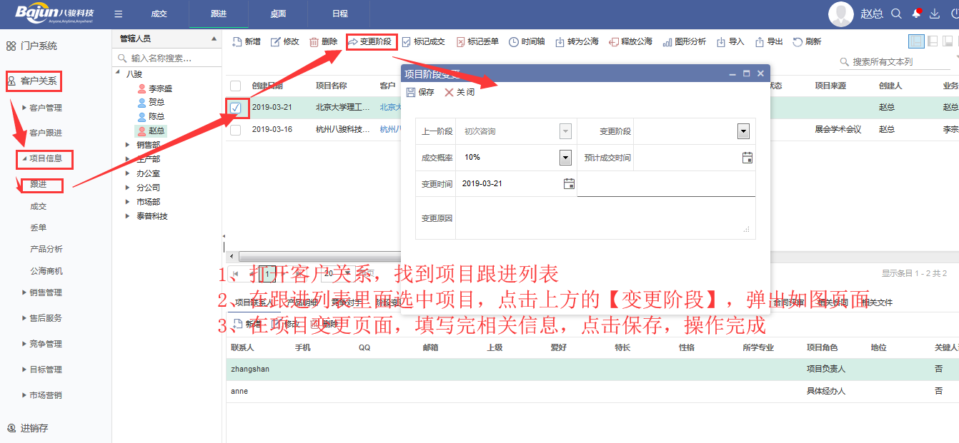 CRM系統比傳統的紙質單據的優勢就在于系統能夠靈活處理項目的跟進過程、流程、以及對數據的處理,能夠大大節約傳統方式的人力和物力;對于項目階段的管理,八駿CRM系統也是比較靈活的,可以很方便地進行階段變更。