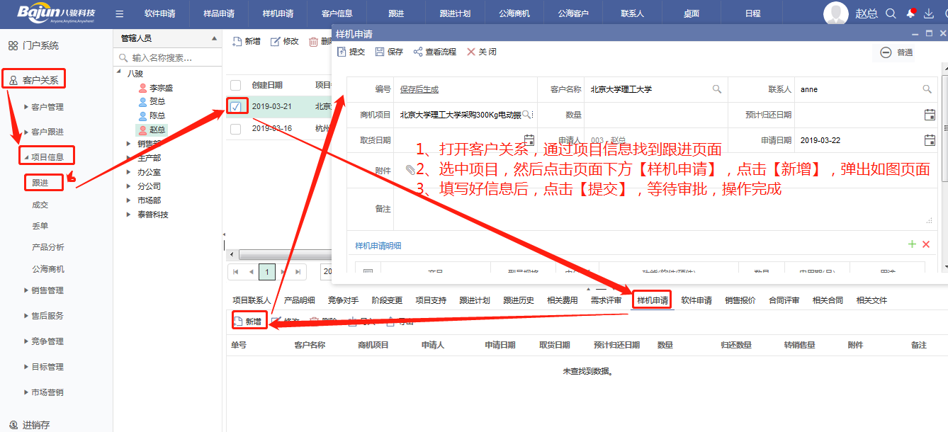 在項目過程中,樣機/樣品申請功能常有用到,八駿CRM系統如何實現樣機(樣品)申請?