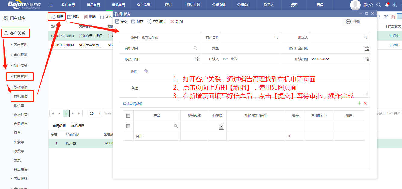 入口:客戶關系--銷售管理--樣機申請