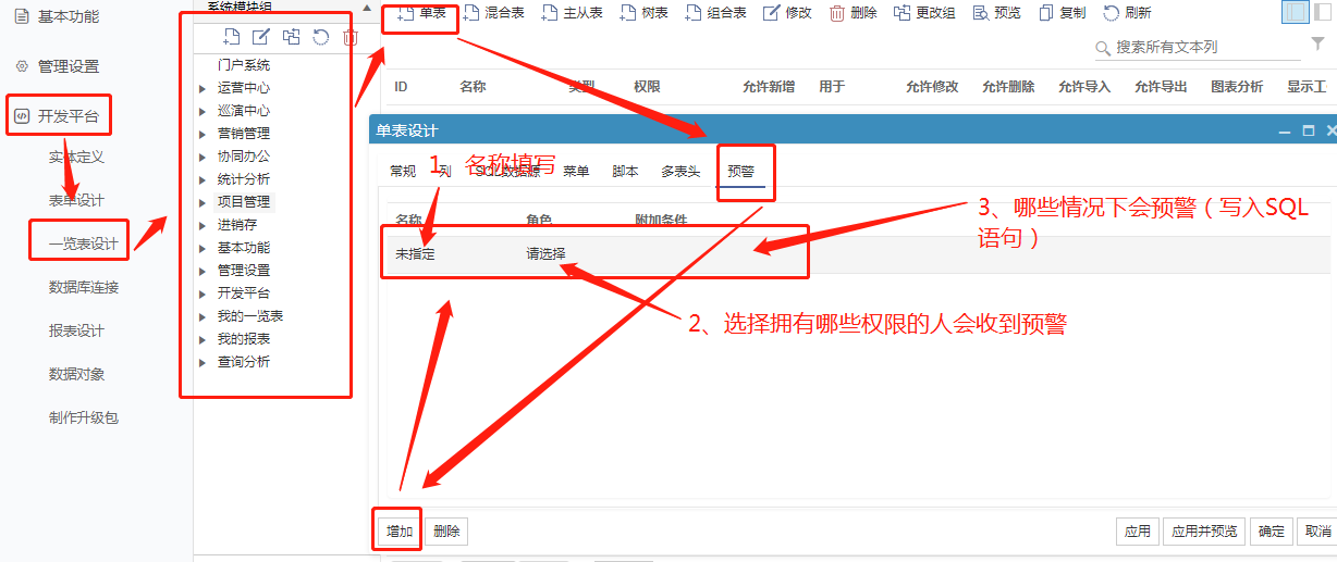 2、找到要配置的單表或直接新建單表,然后在單表設計中選中預警,